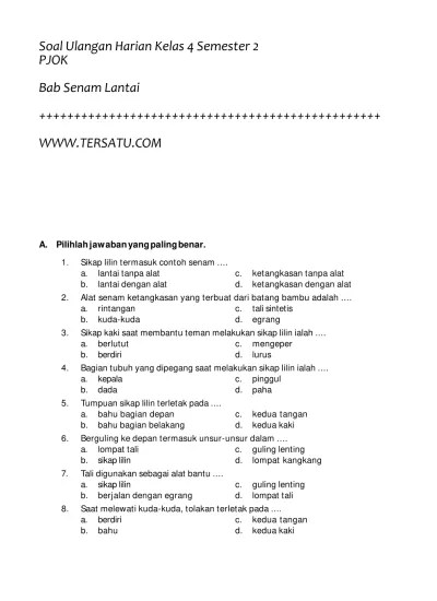 Latihan soal mapel pjok terdiri dari 20 butir soal pilihan ganda. Contoh soal ulangan pjok kelas vii smp/mts materi senam lantai contoh soal pjok smp contoh soal ujian pjok. Berikut, contoh soal pg penjas orkes kelas 10 semester ganjil dengan jawabannya untuk. Sesuai dengan judul, kali ini kami akan membagikan soal . Manfaat latihan senam lantai dalam hal mental maupun sosial adalah.